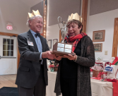 Board member Noreen Rice receives the Morgan 'Sonny' Wayson Memorial Trophy for 2021 from Vice-president Jay Graham. Noreen was designated Recruiter-in-Chief for her extraordinary efforts in increasing membership. The trophy is awarded annually to an individual who has gone the extra mile to improve and promote WRW and croquet.